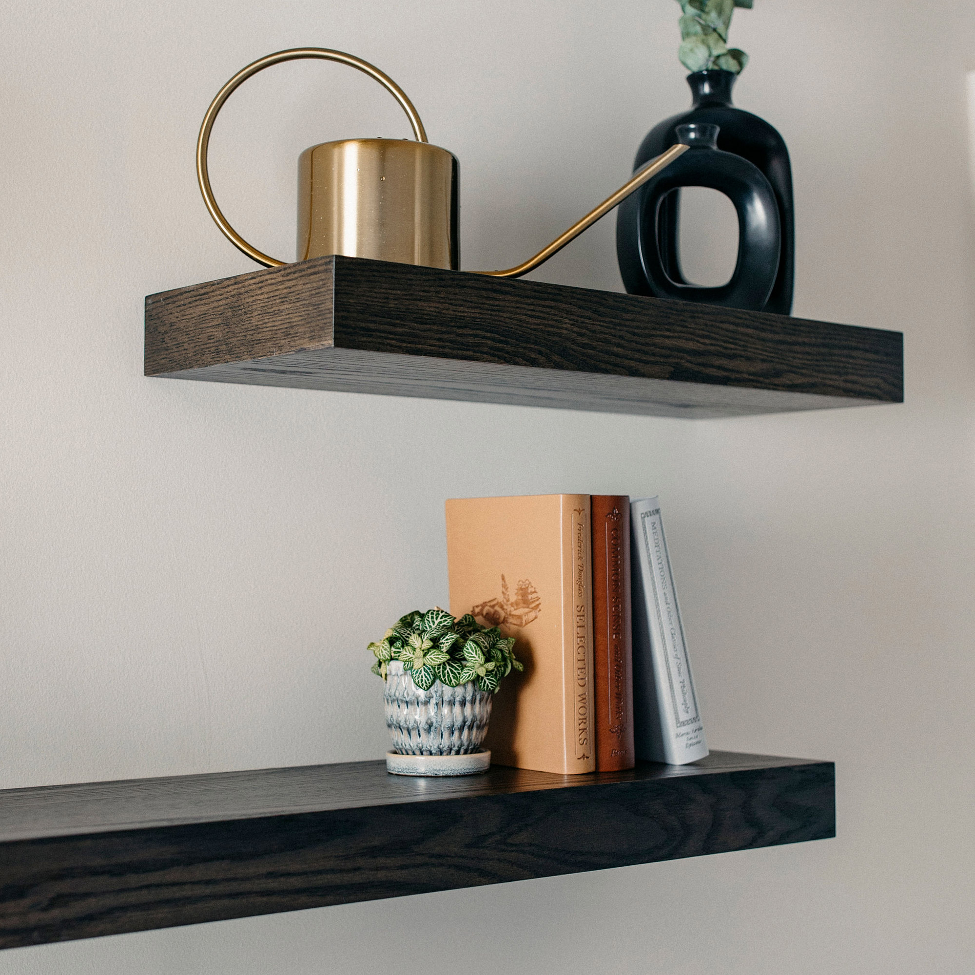 Blackened Mocha Floating Shelves are our premium oak shelves finished in a rich, dark mocha tone with deep, charcoal-brown undertones. This bold, modern finish highlights the natural oak grain and complements contemporary, industrial, and luxury interiors while delivering the strength and durability of real wood.